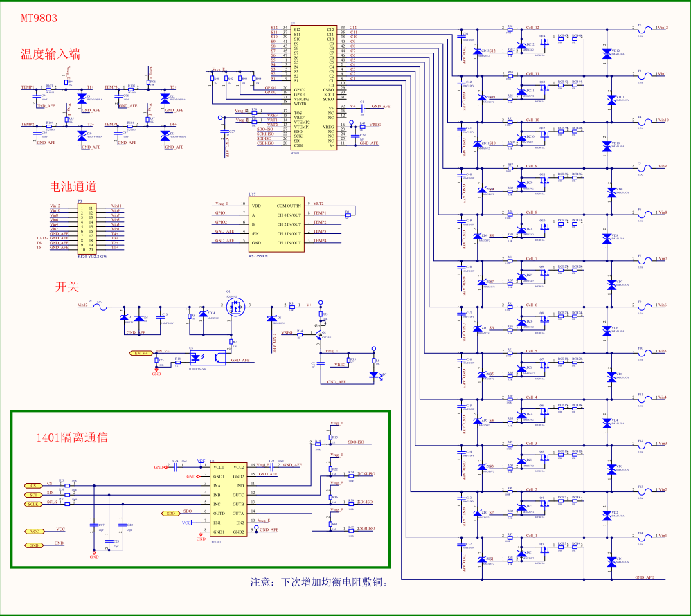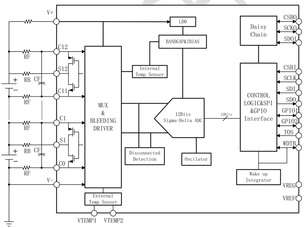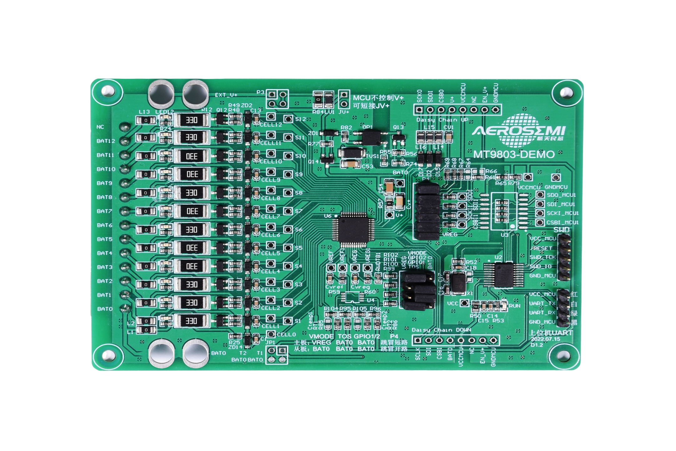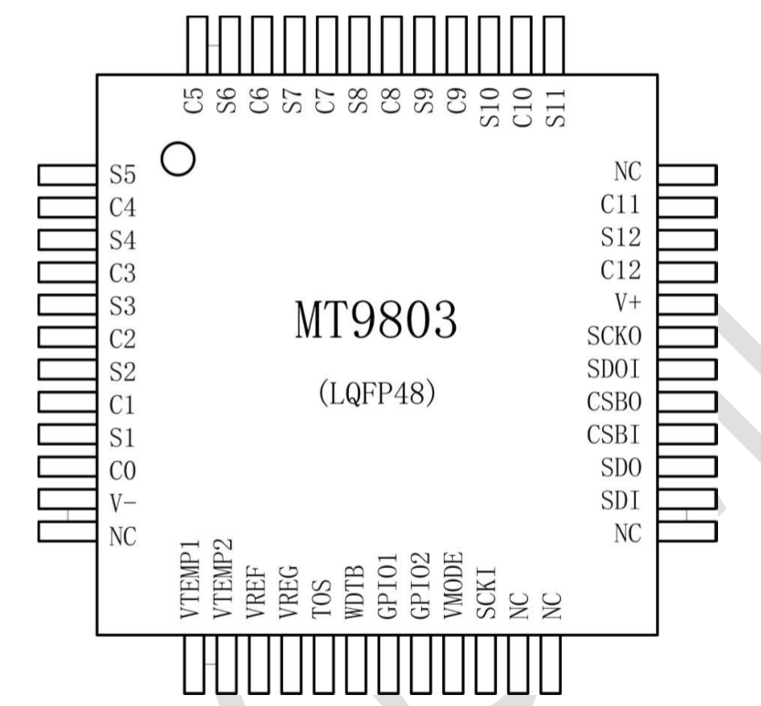 MT9803 是一款低功耗芯片,工作時(shí)電流小于 1.3mA,待機(jī)模式下小于 35uA。最高可以支持 12 節(jié)串聯(lián)電池的信息測量,總的電壓測量范圍為 10~60 V.內(nèi)部包括 12路的 12位電壓采集 ADC,分辨率 1.5mV。同時(shí)還包含一個(gè)片內(nèi)溫度采集通道,兩個(gè)外部溫度采集通道,可在 13ms 的時(shí)間內(nèi)轉(zhuǎn)換全部 12 節(jié)串聯(lián)鋰電池的電壓。MT9803 內(nèi)部集成了電池均衡MOSFET 最大均衡電流為 20mA,并且可以驅(qū)動外部 MOSFET,從而實(shí)現(xiàn)更大的均衡能力。同時(shí),MT9803 可以支持多節(jié)菊鏈?zhǔn)竭B接并進(jìn)行通信,以監(jiān)測長串串接的鋰電池組。芯片集成了開路連接監(jiān)測功能,更好的保證電池的使用安全。芯片通過帶有包誤差校驗(yàn)的 SPI通信協(xié)議與主控 MCU 進(jìn)行數(shù)據(jù)通信,通信時(shí)鐘頻率最高可達(dá) 1MHz。