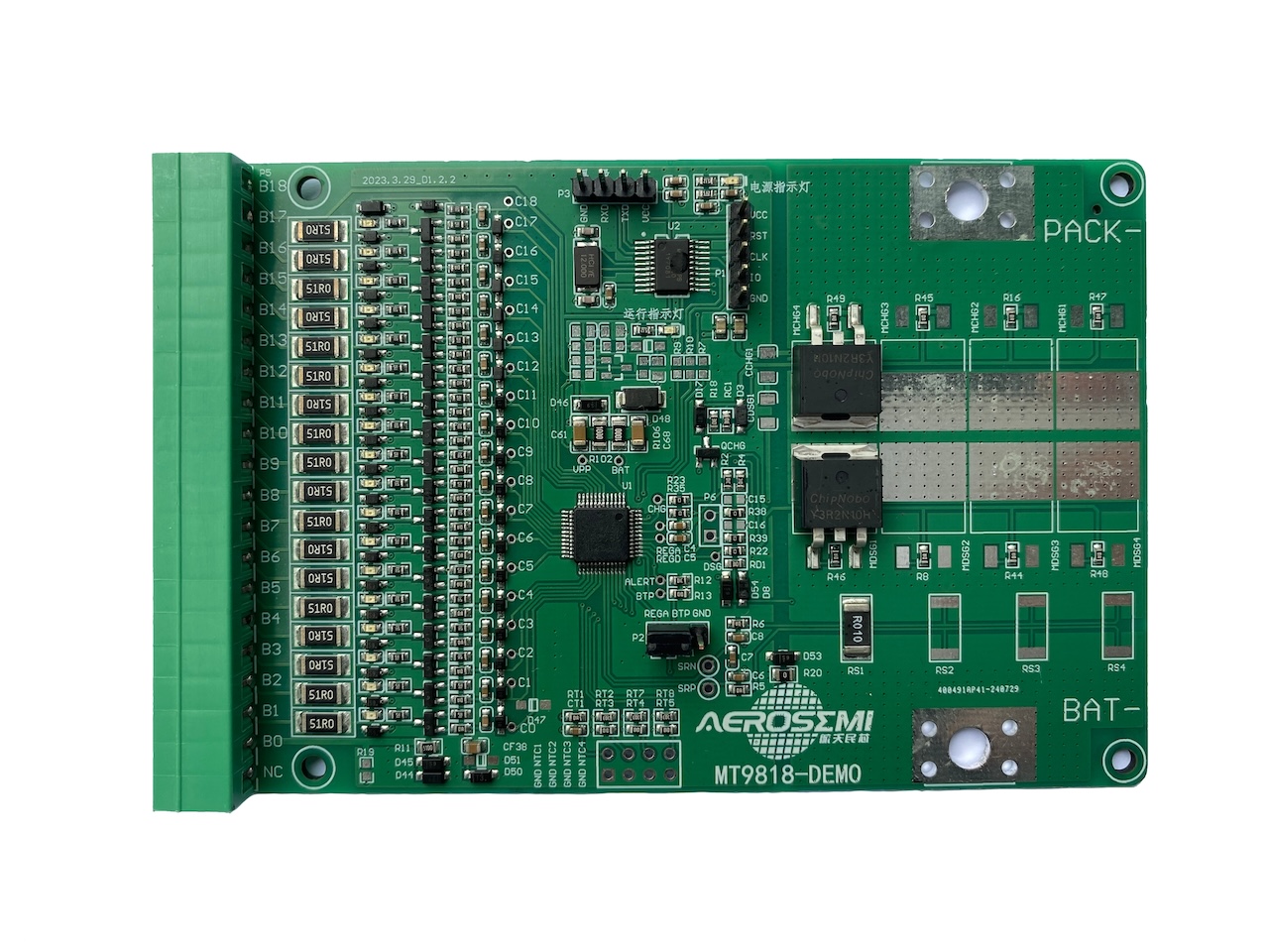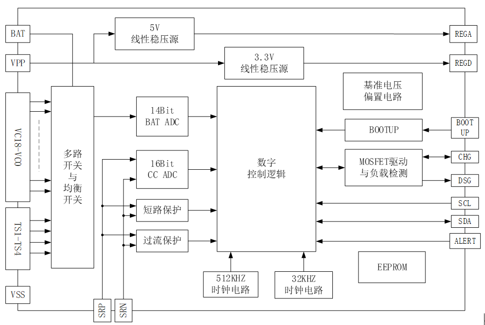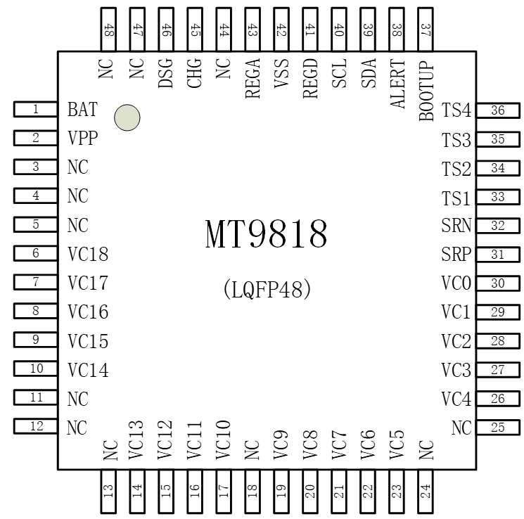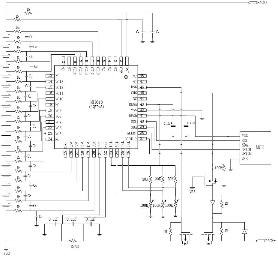 MT9818 是一款低功耗芯片,工作時電流小于 500uA,待機模式下小于 20uA??梢灾С?8~18 節(jié)串聯電池的信息測量,總的電壓測量范圍為 10~90V。內部包括 18 路的 14 位電壓采集 ADC,分辨率 400uV。同時還包含 4 個外部溫度采集通道。MT9818 可提供包括過壓保護、欠壓保護、放電過流保護。此外,MT9818 支持內部均衡與外部均衡兩種均衡方式。均衡技術的應用,使電池組特性在充電時保持良好的一致性,有助于延長電池組的使用壽命。MT9818 內部含有一個 128 位 EEPROM,存儲 BAT ADC 和 CC ADC 的增益誤差和失調誤差。MT9818 兼容 I2C 總線接口。