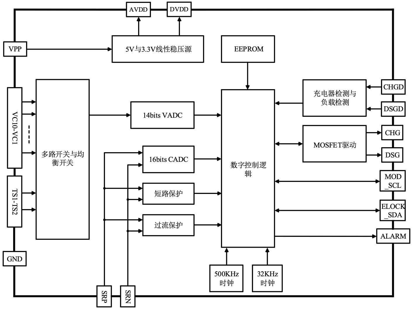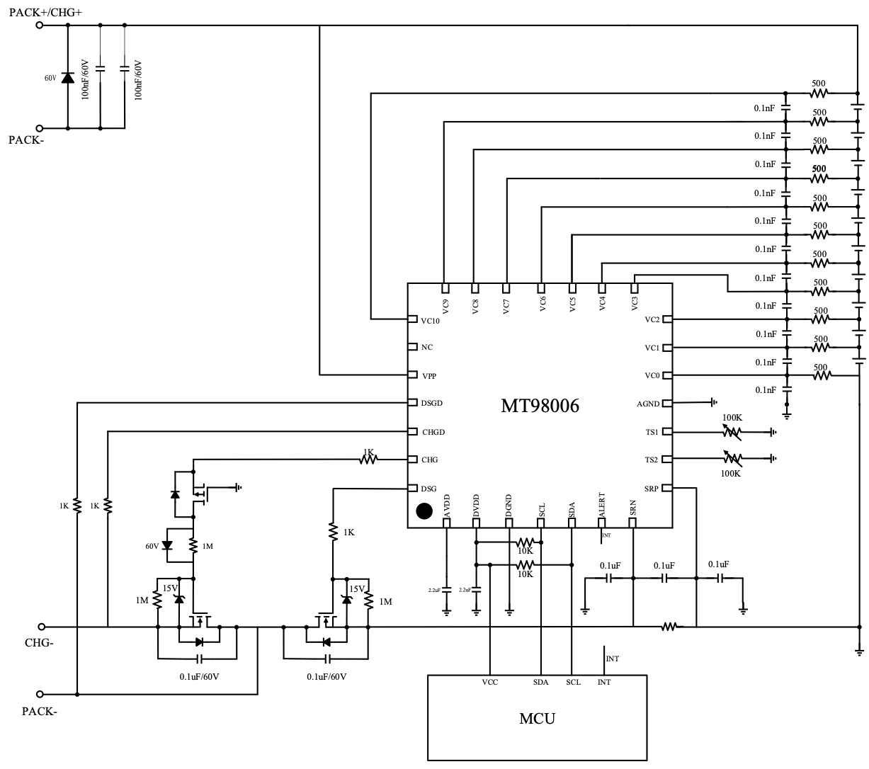 MT98006是一款專為鋰電池BMS設(shè)計(jì)的模擬前端芯片,全功率工作狀態(tài)電流小于350μA,待機(jī)狀態(tài)工作電流小于260uA,休眠狀態(tài)工作電流小于20μA,支持6~10節(jié)串聯(lián)電池監(jiān)測(cè)以及2通道溫度監(jiān)測(cè)。內(nèi)部集成一個(gè)14位VADC,用于測(cè)量電池電壓和溫度,以及一個(gè)分辨率可配置(16/13位)的CADC用來(lái)監(jiān)測(cè)電流。MT98006集成了多種安全保護(hù)機(jī)制,可對(duì)以下安全事件執(zhí)行高精度和可靠性保護(hù):過(guò)壓、欠壓、充/放電過(guò)流、放電短路、過(guò)溫保護(hù)。MT98006集成了電子鎖功能,對(duì)于電動(dòng)自行車(chē)或者無(wú)線吸塵器等電器,通常在系統(tǒng)需要機(jī)械開(kāi)關(guān)來(lái)切斷放電路徑,本芯片提供了獨(dú)立的引腳來(lái)實(shí)現(xiàn)該功能。MT98006能夠配合MCU等主控單元在主機(jī)模式 (Host Mode) 下工作,也能工作在獨(dú)立模式 (Standalone Mode) 下,獨(dú)立完成鋰電池的監(jiān)控與保護(hù)。MT98006集成了內(nèi)部均衡技術(shù),最大內(nèi)部均衡電流為25mA,如果需要更高的均衡電流,可以使用外部均衡電路。MT98006提供I2C通訊接口,使外部主機(jī)能夠訪問(wèn)內(nèi)部寄存器,以控制芯片功能和讀取電池電壓電流等信息。