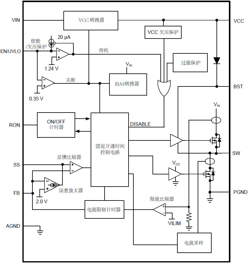 MT2661CF是一款100V、1A的同步降壓轉(zhuǎn)換器,內(nèi)部集成HS和LS開關(guān)。采用恒定導(dǎo)通時(shí)間的控制模式(COT),無需外部頻率補(bǔ)償,并且具有快速的瞬態(tài)響應(yīng)。內(nèi)部的反饋放大器可以使輸出在全溫范圍內(nèi)保持±2% 的精度。通過RON電阻設(shè)置每個(gè)周期的開啟時(shí)間,使開關(guān)頻率近似恒定。內(nèi)部具有峰值與谷值電流保護(hù)功能。輸入電壓的欠壓值及遲滯值可以通過欠壓鎖定電路(EN/UVLO) 調(diào)整。通過選擇FPWM 引腳的電位,MT2661CF具有不同的工作模式,系統(tǒng)可以在全負(fù)載范圍內(nèi)工作在強(qiáng)制CCM模式,也可以在輕載時(shí)工作在DCM模式。