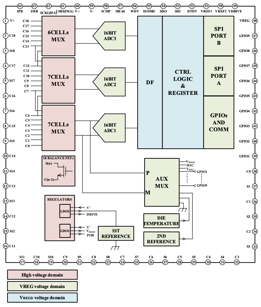 電芯電壓:0~5V GPIO端口:9個(gè) 通訊方式:SPI(支持雙向isoSPI) 均衡模式:外部被動均衡 分辨率:0.1mv 全溫范圍誤差:±3mv 工作溫度:-40~125℃ 待機(jī)電流:10uA 封裝形式:LQFP64-EP 應(yīng)用行業(yè):儲能,電力,工業(yè)控制,無人機(jī) 產(chǎn)品詳情