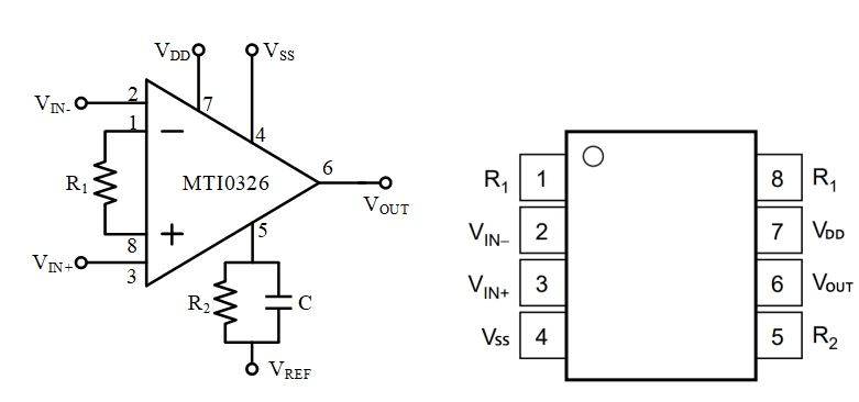 圖2 MTI0326 SOP8封裝示意圖 MTI0326的主要性能指標如下(R1=2kΩ,R2=100kΩ,G=100,典型值): → 電源電壓范圍:2.7V~5.5V → 靜態(tài)電流 :2.3mA → 輸入失調(diào)電壓:5uV → 輸入失調(diào)電壓溫漂:0.1μV/℃ → 輸入偏置電流:300pA → 共模抑制比:114dB → 增益范圍:0.1~10000 → 增益誤差:0.06% → 0.1Hz~10Hz積分噪聲:0.6uVpp → 輸入共模范圍:(VSS-0.02)~(VDD+0.1) → 工作溫度:-55°C ~ +125°C